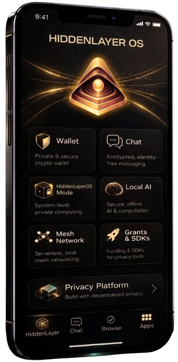HiddenLayer is a decentralized privacy ecosystem powered by local AI and peer-to-peer infrastructure. It enables secure communication, private transactions, encrypted storage, and off-grid connectivity without servers, tracking, or third-party control.